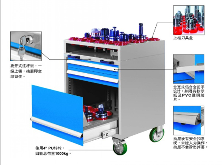刀具車可根據(jù)需要選擇帶抽屜或不帶抽屜的刀具車。